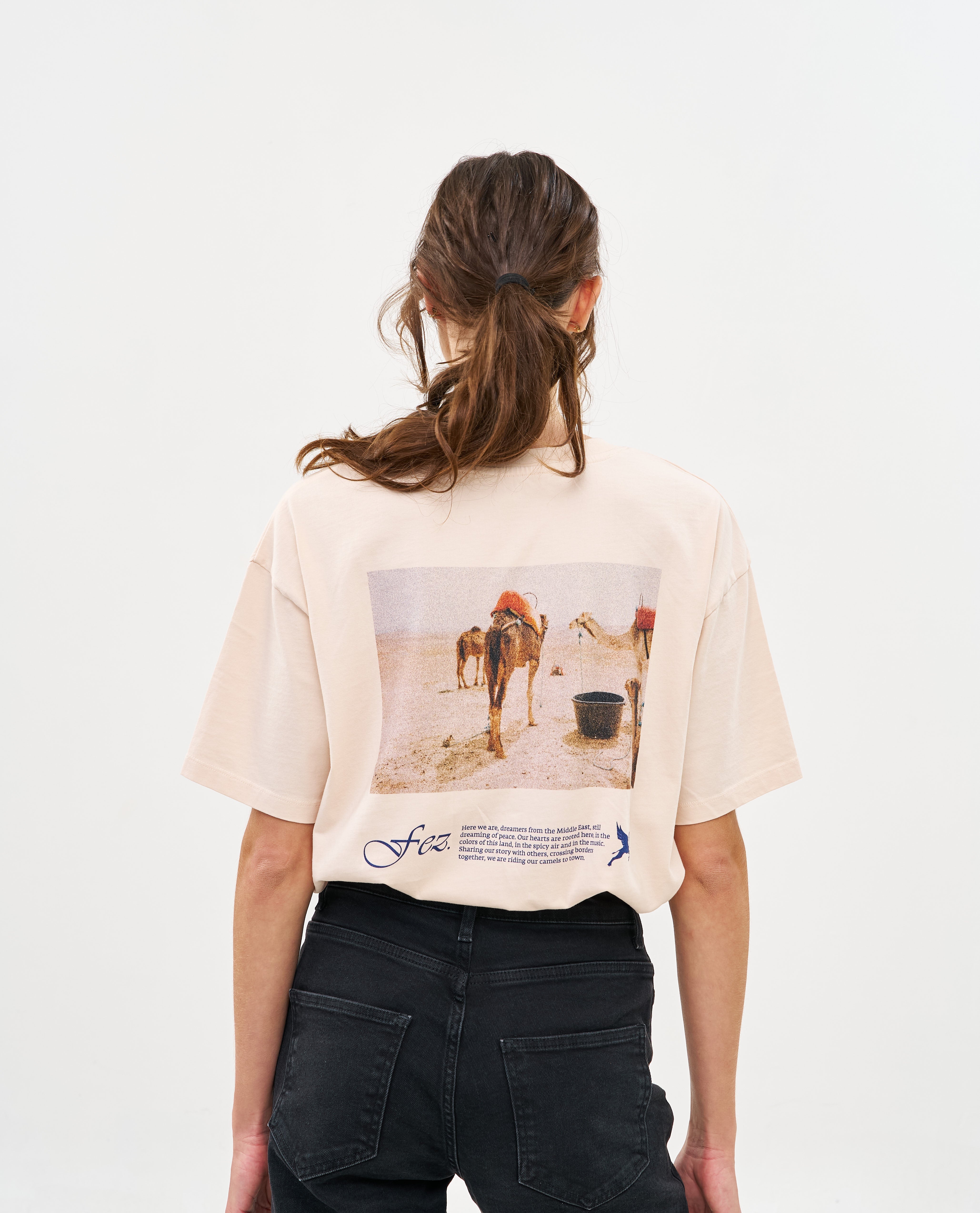 טישרט מתוך הקולקציה החדשה של FEZ, גזרת יוניסקס משוחררת, לוגו קטן מקדימה והדפס גמלים בגב