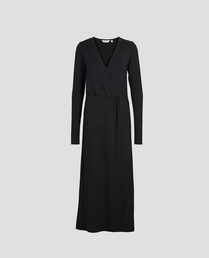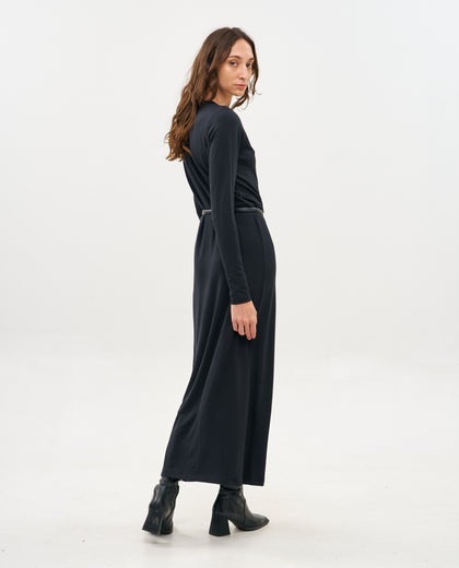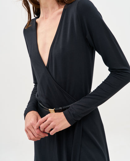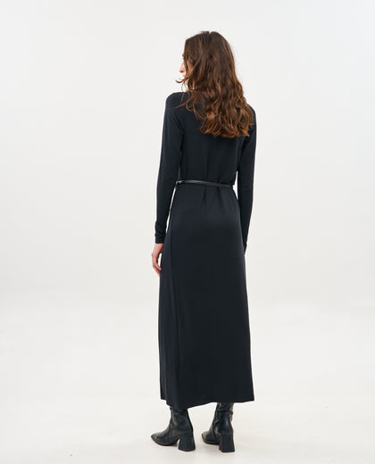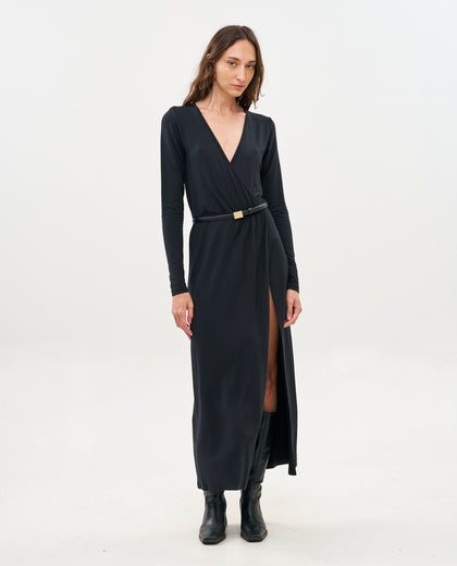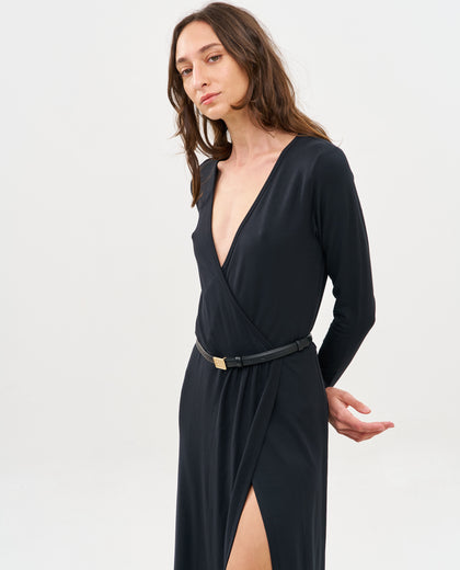 שמלת ג'רזי טריקו מכותנה אורגנית עם מחשוף וי עמוק, גומי במות ושסע משע בצד. אנחנו צלמנו אותו עם חגורת מיני של FEZ ומגפיים גבוהים. יאמי.