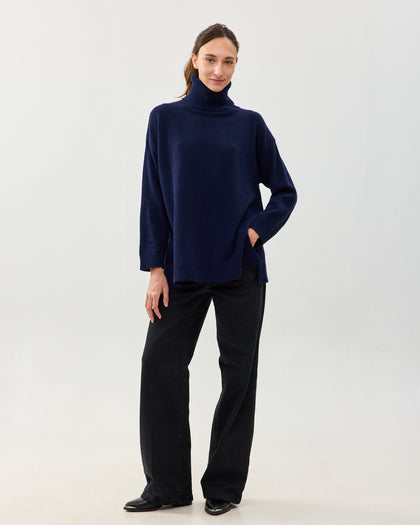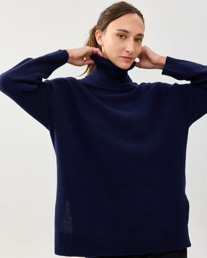 סריג גולף בגזרה משוחררת עשוי צמר רך במיוחד. צווארון גוף מגולגל, תפר כתף שמוטה. קחי את המידה הרגילה שלך למראה אוברסייז, ומידה אחת פחות כדי שישב צמוד יותר. מגיע בצבעים: אפור, ירוק וכחול נייבי