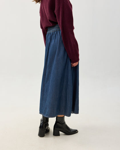 חצאית מידי בגזרת A עם כיסי צד וגומי במותן. עשויה בד טנסל איכותי ומתאפיינת במראה נשפך. הבד הטבעי מעניק לחצאית תחושה קלילה ונעימה.