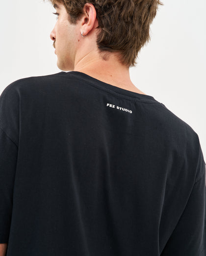 טישרט מתוך הקולקציה החדשה של FEZ, גזרת יוניסקס משוחררת, לוגו של הגמל המעופף רקום מקדימה ולוגו קטן בגב