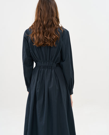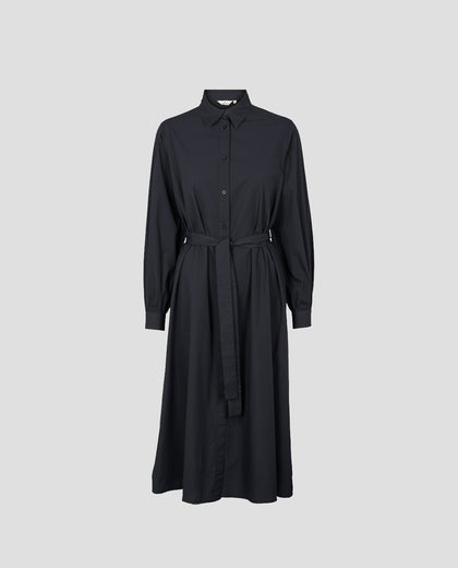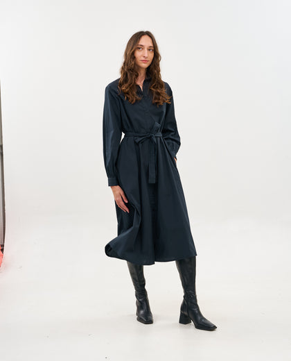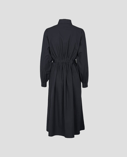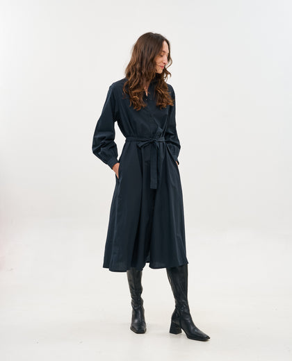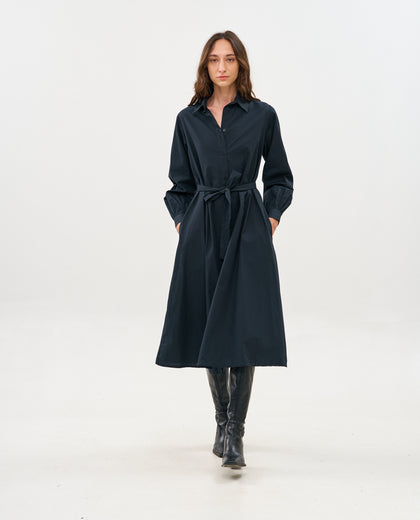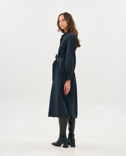 שמלת כפתורים באורך מידי עם גומי במותן, חגורה לקשירה והידוק, שרוולים מעט נפוחים ודיטטיל משגע בגב של כיווצים