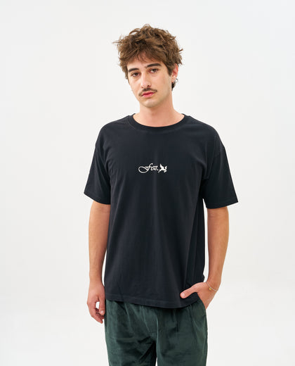 טישרט מתוך הקולקציה החדשה של FEZ, גזרת יוניסקס משוחררת, לוגו של הגמל המעופף רקום מקדימה ולוגו קטן בגב