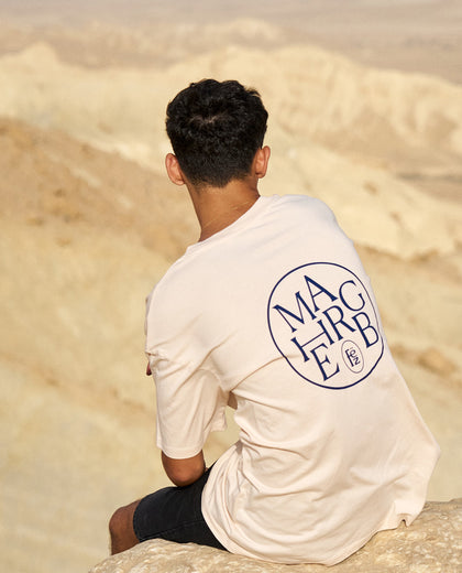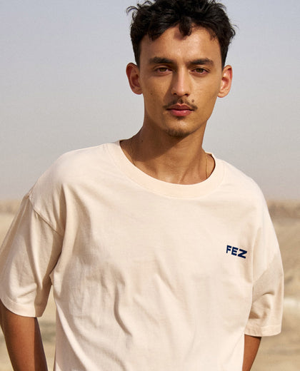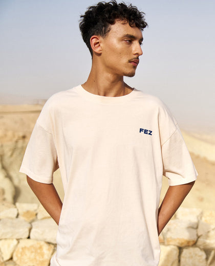 טישרט מתוך הקולקציה החדשה של FEZ, גזרת יוניסקס משוחררת לוגו קטן מקדימה והדפס טיפוגרפי בגב
