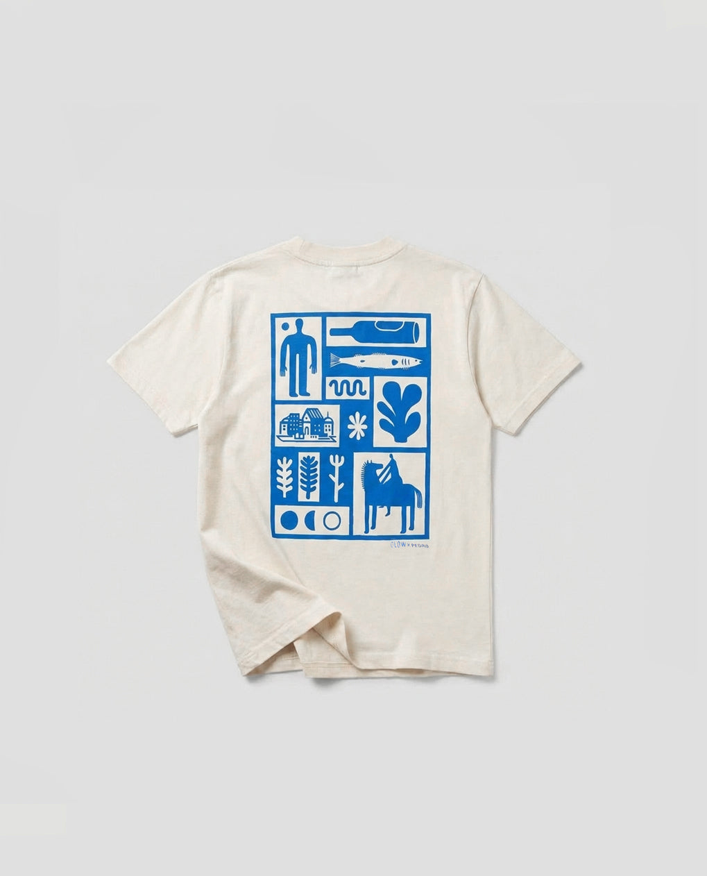 טישרט בגזרת יוניסקס מכותנה אורגנית. קראנו לטישרט essentials  - כל מה שבן אדם צריך, קצת דגים, קצת יין, קצת בית וקצת סוס :) שימו לב...