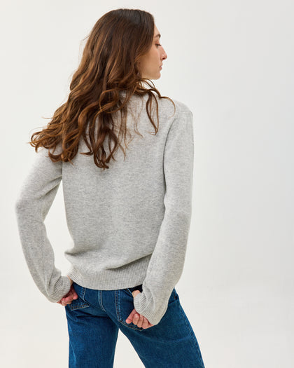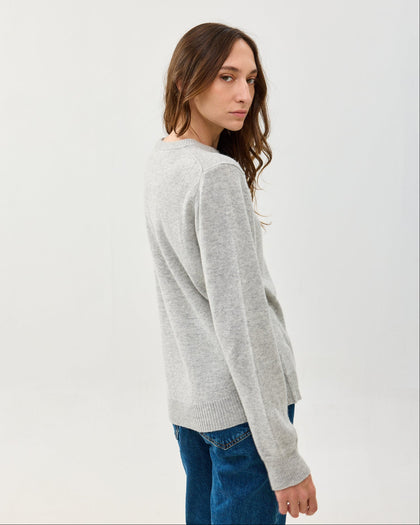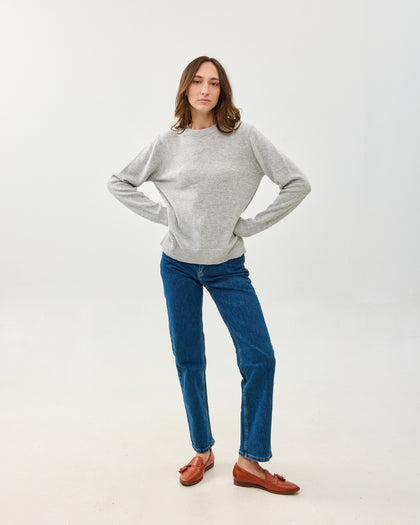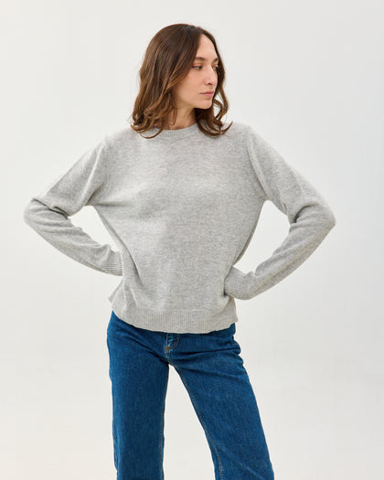 סוודר קלאסי ומשובח עם צווארון עגול, עשוי בלנד של צמר, קשמיר ופולי ממוחזר. רך ואקולוגי, מגיע באפור כהה ובורדו