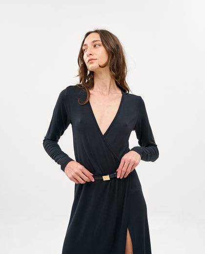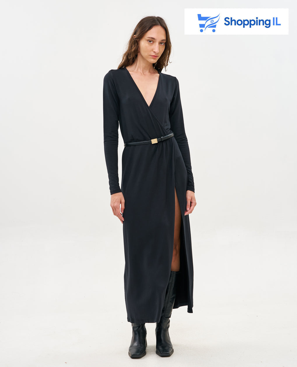 שמלת ג'רזי טריקו מכותנה אורגנית עם מחשוף וי עמוק, גומי במות ושסע משע בצד. אנחנו צלמנו אותו עם חגורת מיני של FEZ ומגפיים גבוהים. יאמי.
